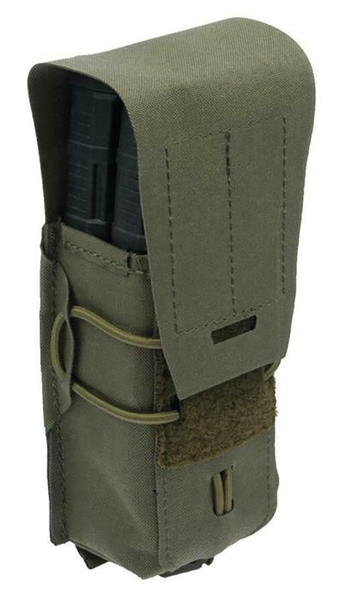 Die Magazine werden mit einer Lache mit Klett und Kordelstopper an der Seite gehalten. Zudem kann die Verschlusslasche weggeklettet und die Tasche somit auch offen genutzt werden.