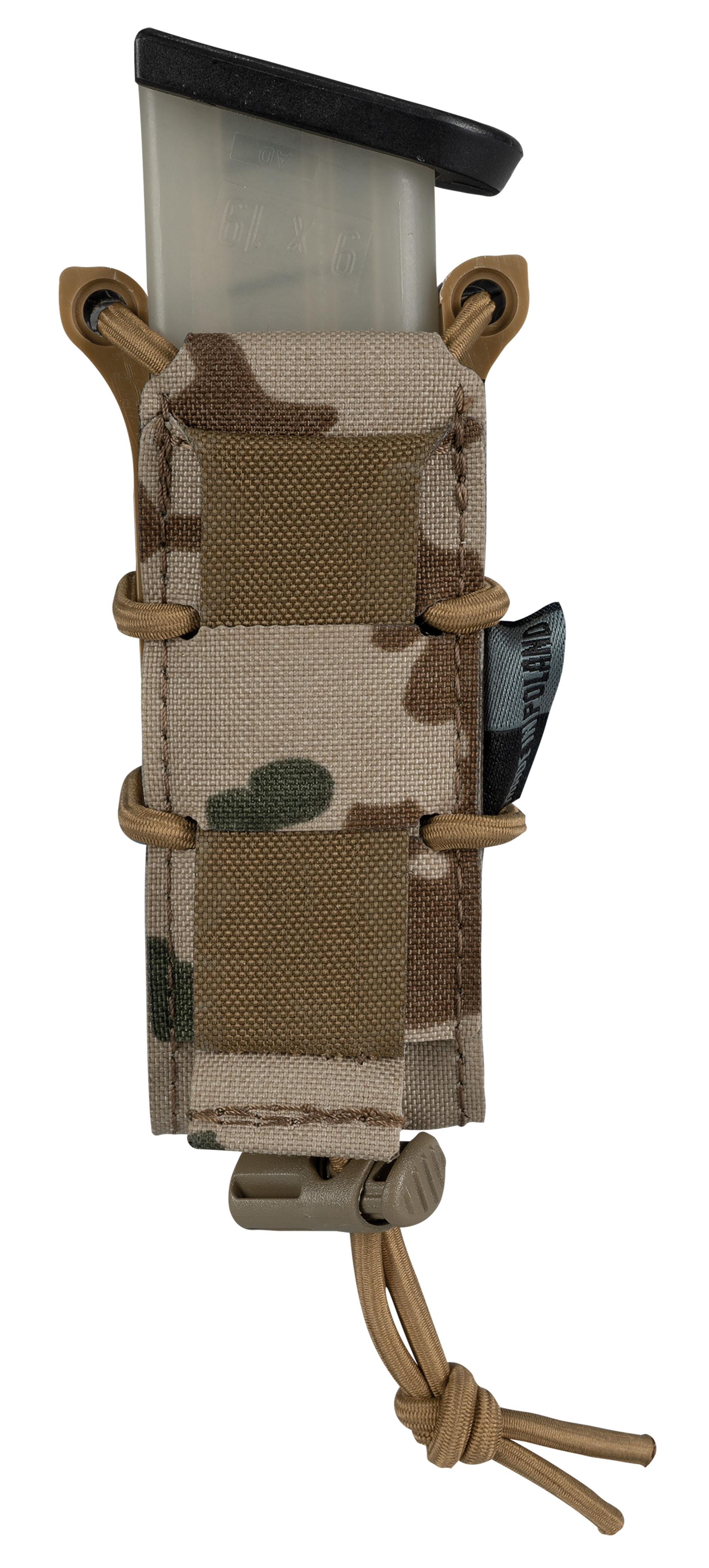 Durch die speziell geformten Polymer Seitenteile lasen sich Magazine schneller ziehen und auch wieder problemlos zurückstecken. Der Fast Pouch kann durch den Bungee-Cord und einem Kordelstopper eingestellt werden.