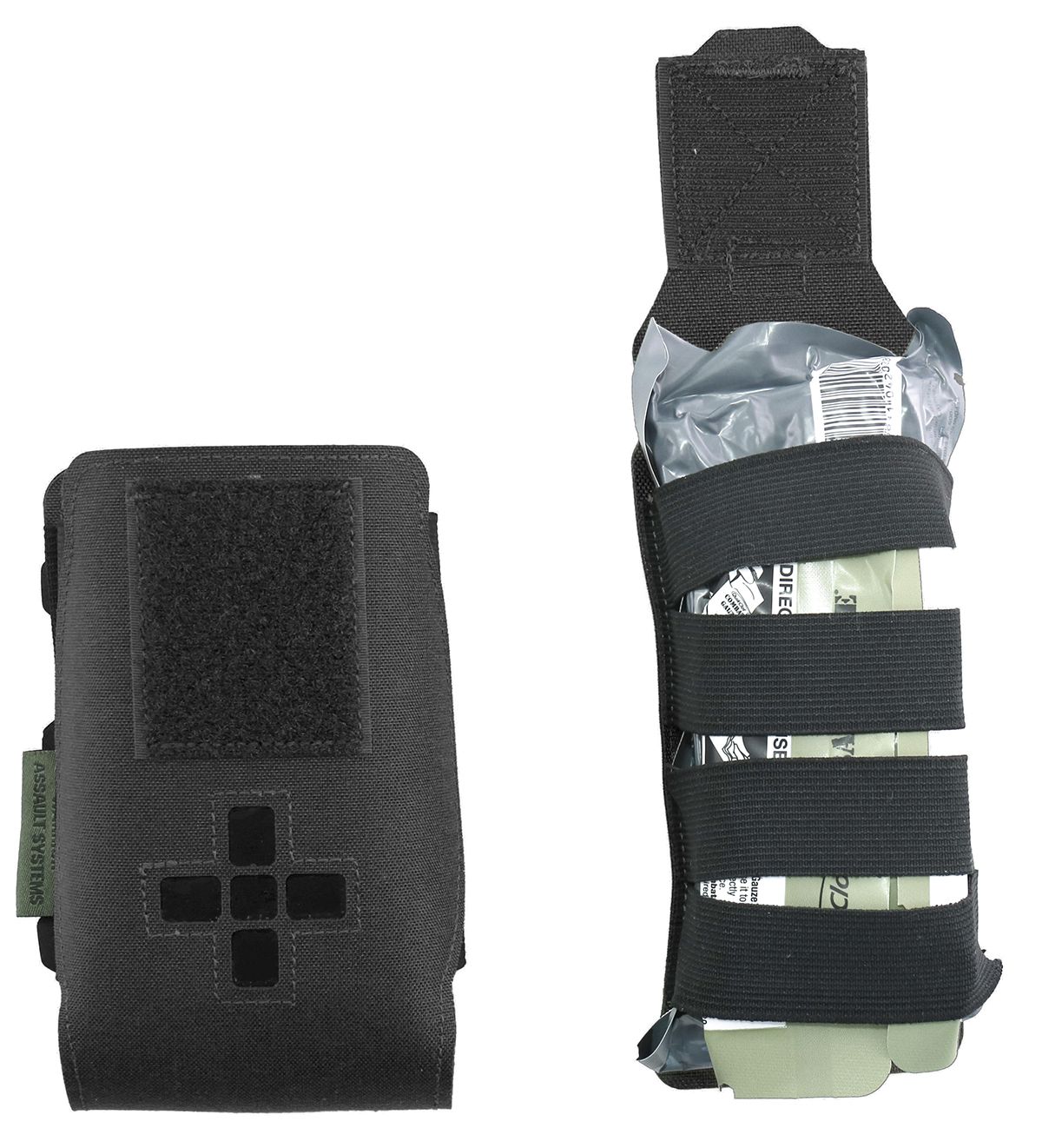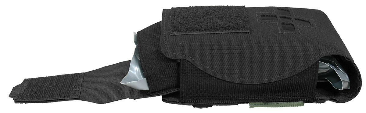 Es biete platz für Combat Cauze, Emergency Bandage oder TQ. Dies wird alles mit elastischen Gummischlaufen gehalten und die Tasche wird mit Laser Cut Molle befestigt.